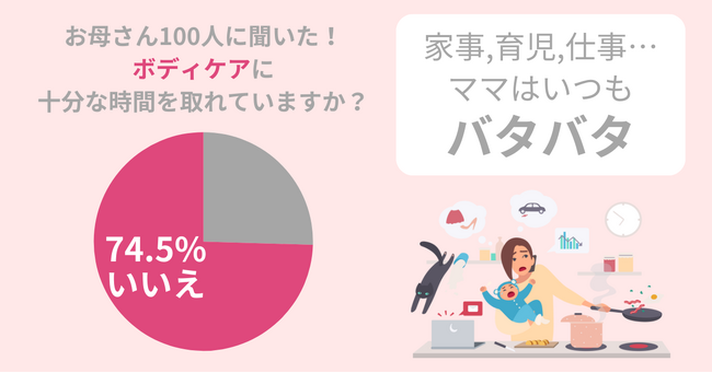 調査の結果、74.5%ものお母さんがボディケアに十分な時間を取れていないことがわかりました。