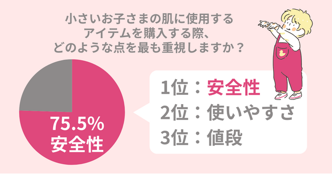 株式会社アースケアはお子様のいる40~50歳の女性100名に「子供の肌に使用するアイテム」に関する調査を行いました。<調査結果>75.5%の母親が子供の肌に使用するアイテムに最も「安全性」を求める