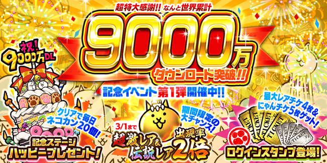 「にゃんこ大戦争」9000万ダウンロード突破記念イベント第1弾開催のお知らせ