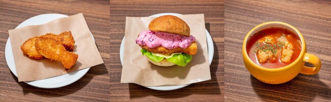 また、子どもに人気のバーガーにもチャレンジ。ミンチしたBタラを魚型にして衣で揚げたパテを、”茎わかめの柴漬け”入りタルタルソースでトッピングした、名づけて「フィレオッタラバーガー」。バンズにも、大間産のアラメ昆布を混ぜてある津軽海峡の恵みいっぱいのバーガーです。さらに、バーガー用の魚型パテを作る際にどうしても余ってしまう”端っこ”も、スープに入れて活用し「Bタラと野菜の具だくさんスープ(ミネストローネ)」として仕上げました。子どもたちがついつい食べたくなるような、見た目も可愛い“魚のファーストフード”メニューの誕生です。