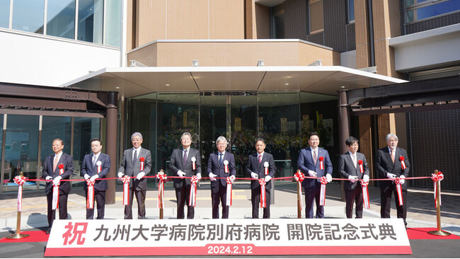 新病院の開院に先立ち、2月12日には記念式典を開催しました。式典当日は晴天に恵まれ、元防衛大臣の岩屋毅衆議院議員、自見はなこ内閣府特命担当大臣、長野恭紘別府市長をはじめ、多くのご来賓に参加をいただきました。本学からは、石橋達朗総長、三森功士別府病院長、中村雅史九州大学病院長らが参加しました。テープカットや施設内覧会、祝賀会も行われ、別府病院の新たな門出を大勢で祝いました。