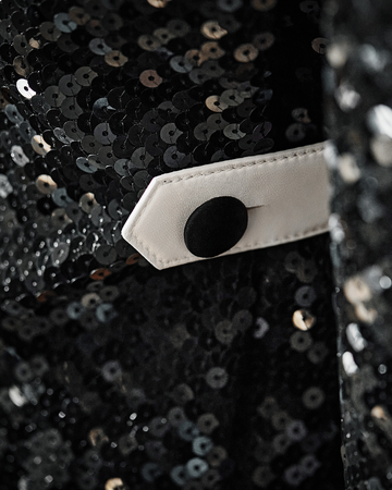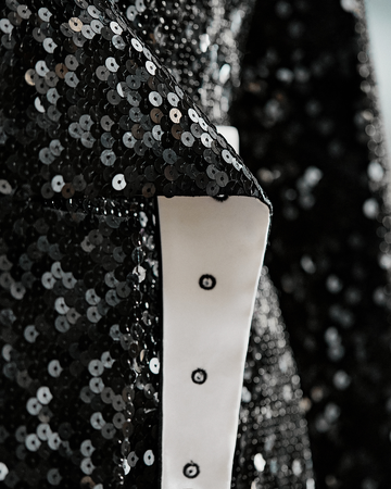 サンドラ・フラーが着用したこのツーピースのノーカラースーツは、ブラックのラップアラウンドジャケットに対照的な白いサテンの裏地を使用して作られました。