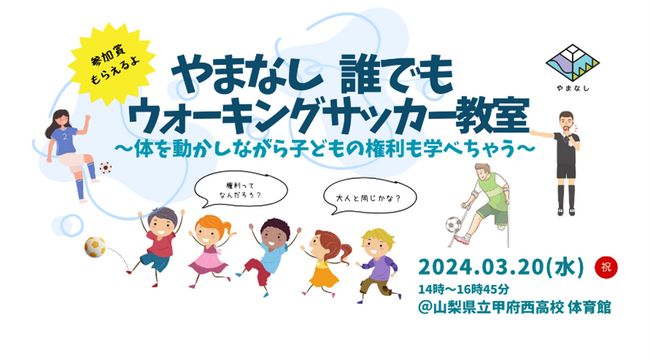 山梨県(知事:長崎幸太郎)では、子どもの権利について正しく理解するための機会として、一般社団法人日本ウォーキングサッカー協会(代表理事:金田幸子/本部:東京都)の協力のもと、年齢、性別等を問わず「誰も」ができるウォーキングサッカーを楽しみながら、子どもの権利を学ぶスペシャルイベント「やまなし誰でもウォーキングサッカー教室~体を動かしながら子どもの権利も学べちゃう~」を開催しますのでお知らせします。