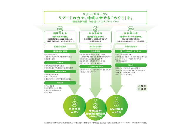 ウェルネス事業における目指す姿を実現するためには、リゾート施設の開発時だけでなく、販売・運営にわたって連携して取り組むことで、リゾート施設を訪れるお客様やステークホルダーの皆さまに、リゾート地ならではの地域と自然と共生することの重要性を自ずと体感頂き、日常における環境意識の向上に繋がるきっかけを提供することが大切です。