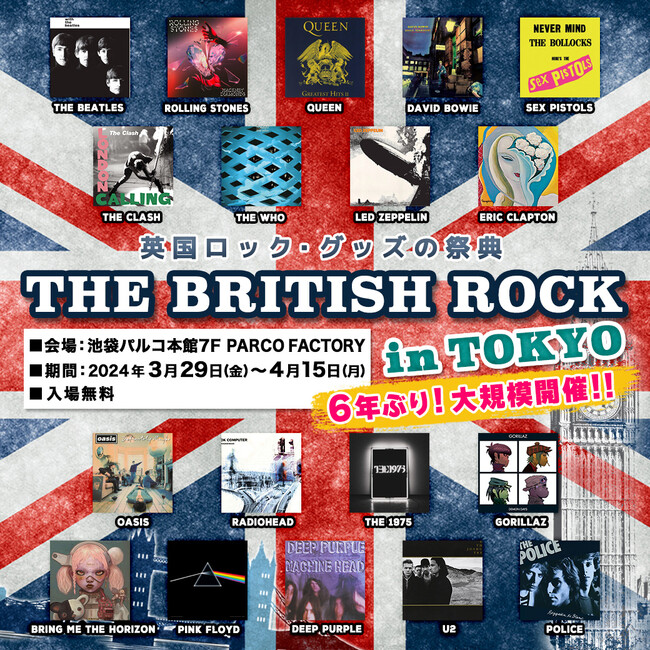 日本最大の音楽・映画・ドラマ・スポーツ・アニメ公式グッズ・ストア PGS、世界で最も長い歴史を持つTHE BEATLES専門店GET BACK、メンバーも認めるROLLING STONES専門店GIMME SHELTERを運営する株式会社JAMSHOPPINGは、人気英国ロック・バンド/アーティストの公式グッズ・ストアを大集結させた英国ロック・グッズの祭典『THE BRITISH ROCK in TOKYO』を、3月29日(金)より東京・池袋パルコ本館7F PARCO FACTORYで開催いたします。