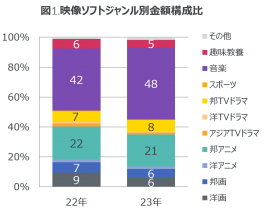 ジャンル別の金額構成比では、「Snow man」や「King & Prince」等のライブ作品で非常に好調だった音楽が前年から6%ポイント伸長し、48%となった(図1)。その一方で、前年「トップガンマーヴェリック」が注目を集めた洋画は構成比6%と前年から3%ポイント縮小となった。