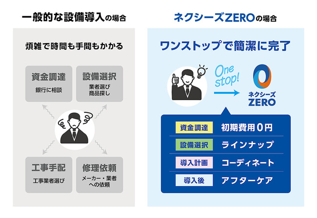 「ネクシーズZERO」は事業者が設備導入する際の資金調達(ファイナンス)を担い、時間や手間の煩雑さを取り除くことで購入意欲を高める仕組みとして、中小企業を中心に国内のあらゆる企業・自治体へ加速度的に普及しております。