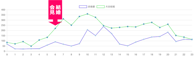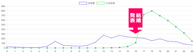 ・大谷選手の結婚発表があったのは16時30分頃で、政倫審の記事は16時以降緩やかに減少。大谷選手結婚の記事数がピークを迎えた18時台に、政倫審の記事数は落ち込んでいることがわかります。