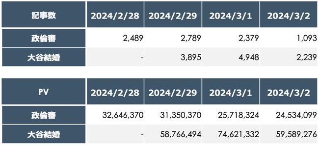 2月29日の政倫審報道は、大谷選手の記事数の71%、PVは53%。