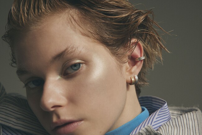 1.テクスチャーのように存在するロゴがシンプルなスタイリングをアップデートするピアス。全1種