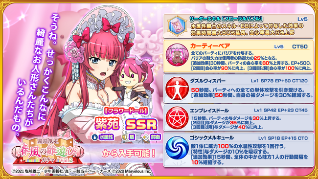 本日開始の「春風の雛遊びガチャVol.2」では、新たに「【フラワードール】紫苑」(CV:金元 寿子)が登場。