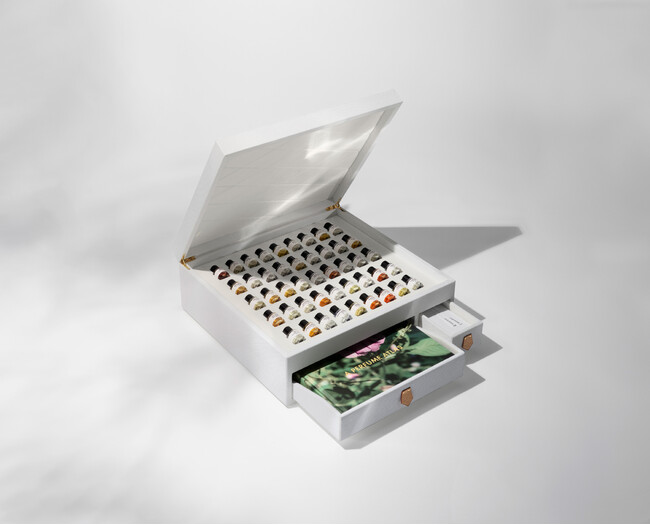 熱心な読者の方々に感覚的な旅を心ゆくまで楽しんでいただける、「A Perfume Atlas」の 限定版も登場。ジャック・キャヴァリエ・ベルトリュードが特別に選定し、紹介する最高級の原材料から抽出したエッセンス入りの45本の小瓶を収めたエクスクルーシブなセットです。