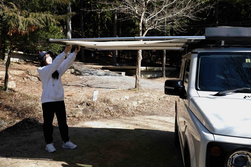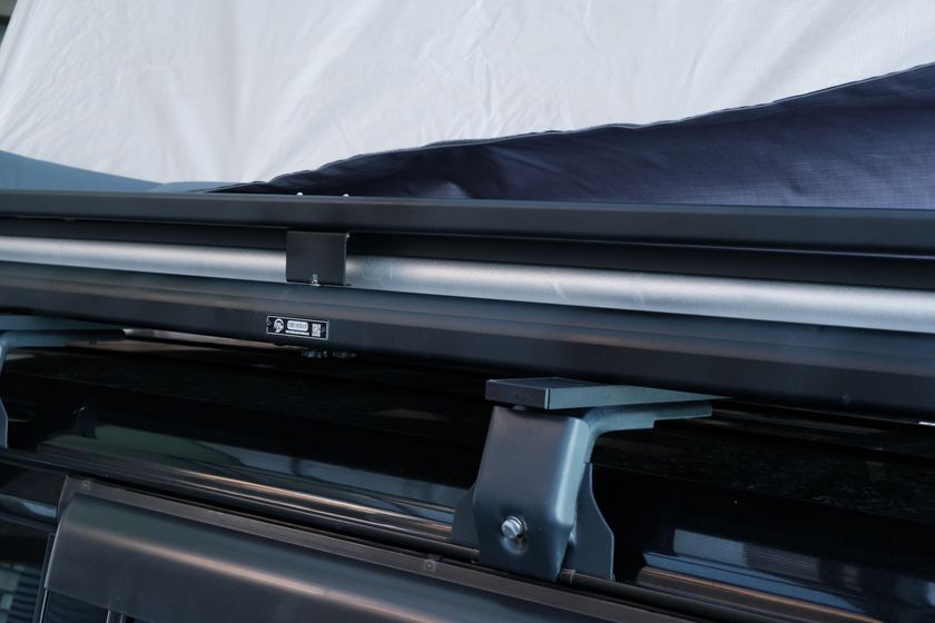 サイドフレームに内蔵されたサイドオーニングはワンタッチで設営可能。サイドオーニングが収納されているとは思えないミニマルな見た目も特徴です。アウトドアのたびにタープやシェードを積み込む必要がなく、気軽に車中泊やキャンプができるようになります。