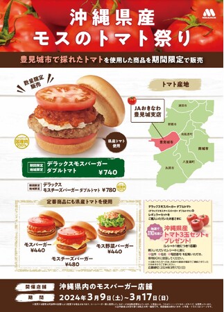 モスバーガーを展開する株式会社モスフードサービス(代表取締役社長:中村 栄輔、本社:東京都品川区)は、2024年3月9日(土)~3月17日(日)の9日間、沖縄県のモスバーガー21店舗で、トマトを使ったすべての商品に、沖縄県内のモスの契約農家である『JAおきなわ 豊見城支店』で収穫されたトマトを使用する『沖縄県産モスのトマト祭り』を開催します。また同時に、地域・期間限定商品も販売いたします。
