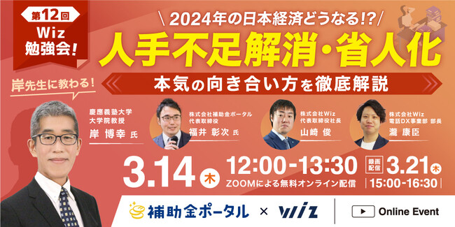 3月14日(木)、3月21日(木)※、株式会社補助金ポータル(本社:東京都渋谷区、代表取締役 福井彰次)は、株式会社Wiz(本社:東京都豊島区、代表取締役社長:山崎 俊)が主催する、「3/14(木) 【岸先生に教わる!】2024年の日本経済どうなる!?~人手不足解消・省人化との本気の向き合い方~」のオンラインセミナーににゲスト登壇することとなりましたことをお知らせします。