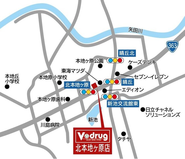 V・drug 北本地ヶ原店は、国道363号「北本地ヶ原」交差点東に位置します。