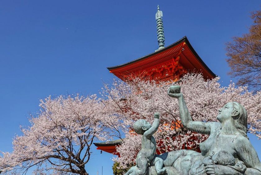 園内には、小彼岸桜・しだれ桜・ソメイヨシノ・八重桜など複数の桜が植樹されております。多品種の桜を植樹しているため、早咲きから遅咲きまで長く、様々な桜をお楽しみいただくことができ、春はお彼岸期間に限らず、多くの方にご来園いただいております。中でも、三重塔前の早咲き桜が開花すると、青空を背景にした三重塔の朱色が一層に映え、ご来園者の目を楽しませます。