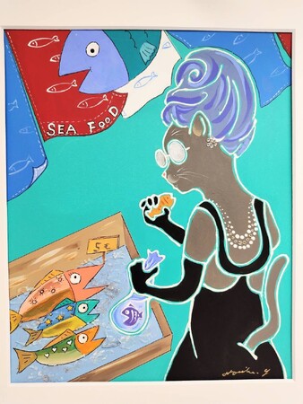「魚屋で朝食を」3号 額付きアクリル、ミクストメディウム、スワロフスキー 価格99,000円