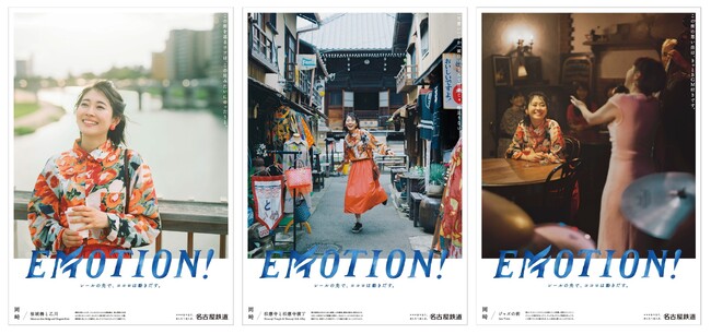岡崎のまちの魅力に触れている河村花さんのリアルな感情を表現した岡崎篇のポスター3種を、3月8日(金)から、当社駅および岡崎市内各所に掲出します。
