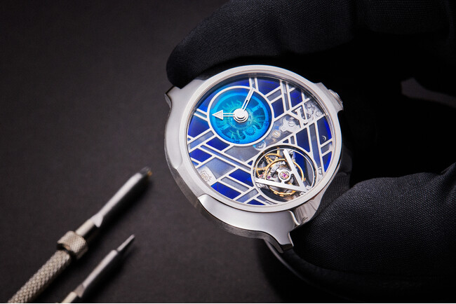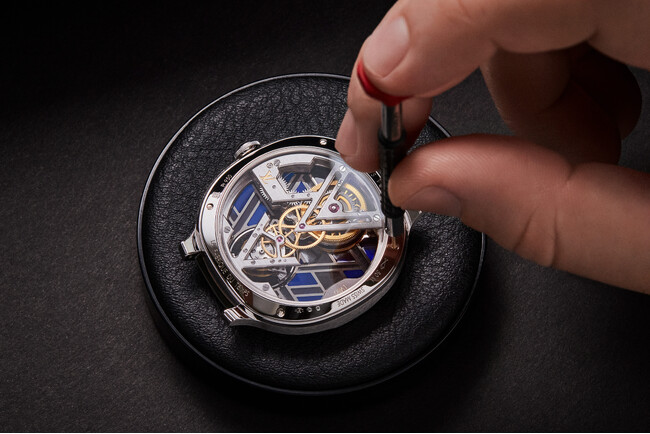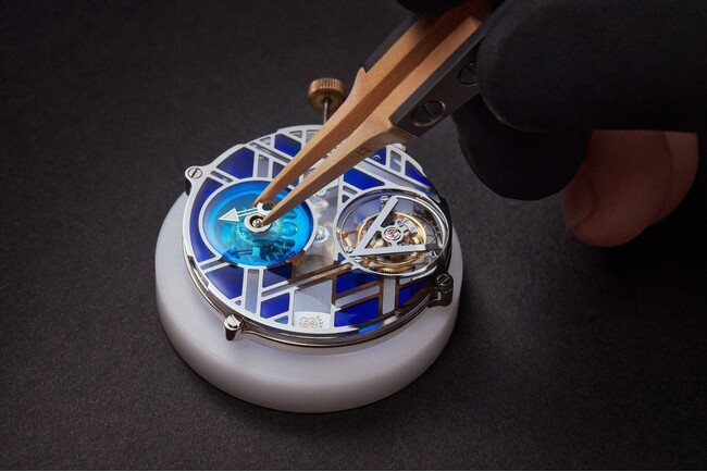 このブルーのグラデーションを表現するためには、何ヶ月にもわたる研究が必要でした。これを実現すべく、メゾンは「ラ・ファブリク・デ・アール」のアトリエに携わる数名の熟練したエナメル職人と協業。「ヴォヤジャー フライング トゥールビヨン ポワンソン・ド・ジュネーヴ プリカジュール」のダイアルはすべて「ラ・ファブリク・デュ・タン ルイ・ヴィトン」のアトリエで製作されました。