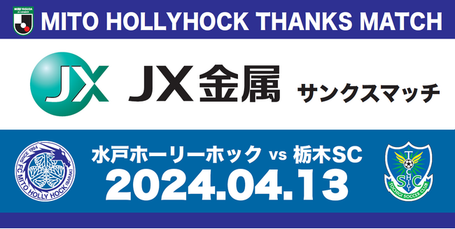 4月13日(土)に開催するホームゲーム、2024明治安田J2リーグ第10節 水戸ホーリーホック vs. 栃木SCをJX金属株式会社にご支援いただき『JX金属サンクスマッチ』として開催いたします。