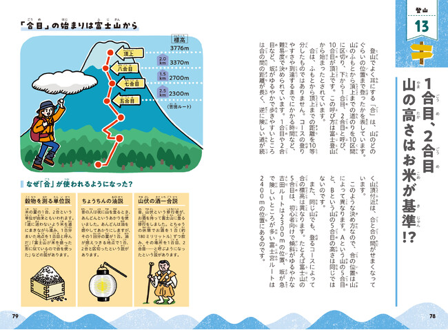 知ってた? 富士山の「五合目」と呼ばれる山の高さは、距離ではなく、登りやすさなどの難易度で決められています。「合目」という単位を使うのは「ちょうちんの油説」「お米の単位説」「お酒一合説」があるなど、おもしろ知識が満載。