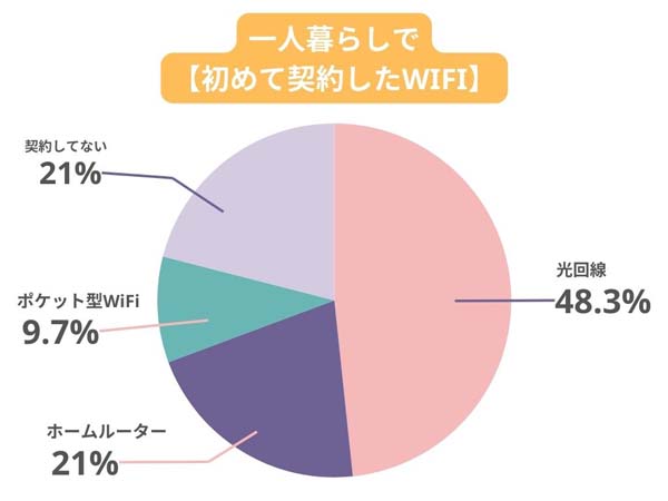 一人暮らしで初めて契約したWiFiは「光回線」48.3%、「ホームルーター」21%、「ポケット型WiFi」9.7%と、半数近くは光回線を契約している結果になりました。