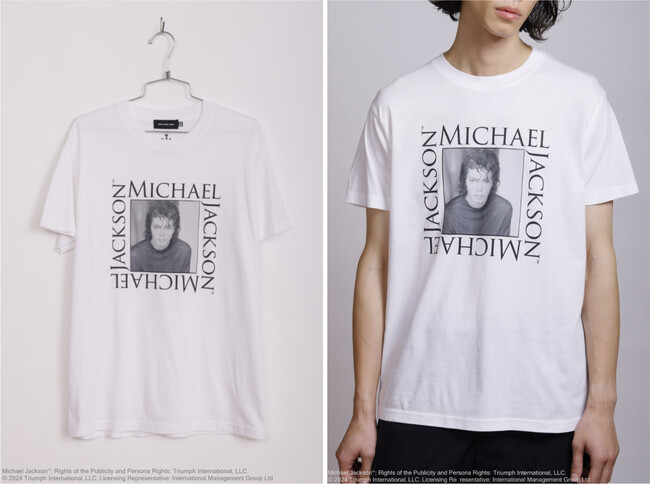 『OFF THE WALL(オフ・ザ・ウォール)』のアルバムカバーと同じタキシードを着たマイケルの写真をモノクロにアレンジしたTシャツ。