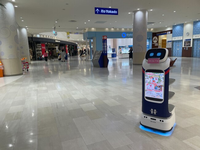 アリオ橋本では、インフォメーションセンターのサポートを目的として、AIコミュニケーションロボット「Cruzr」1台と、大画面ディスプレイによる広告を流すロボット「CADEBOT」2台の実証を実施しました。