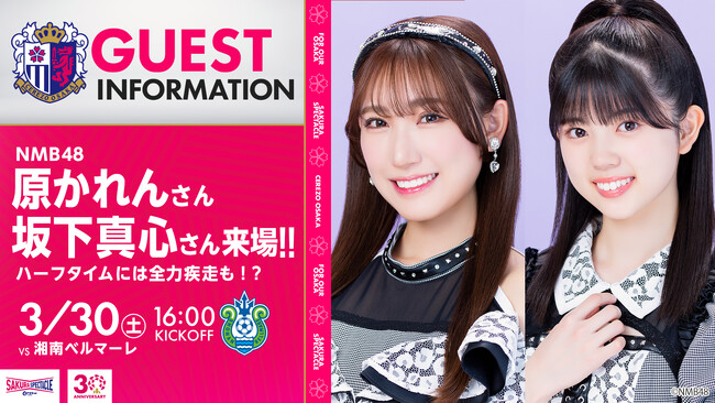 3/30(土)湘南戦に、大阪・難波を拠点に活動するアイドルグループ、NMB48・原かれんさん、坂下真心さんの来場が決定しましたのでお知らせいたします。試合前のトークショー参加だけでなく、レフェリーエスコートや、ハーフタイムでピッチで走ったりと縦横無尽に活動していただきます!