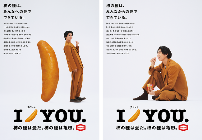 第1弾として、賀来さんを起用した新CMのテーマは、『亀田の柿の種』への愛を表現した「I カリッと YOU.柿の種は愛だ。柿の種は亀田。」です。そのテーマのもと制作された新CM『IカリッとYOU ダンス篇』 『IカリッとYOU うましお篇』 『IカリッとYOU ダンス&うましお篇』は、3月13日(水)より全国で順次放送開始いたします。新CMは柿の種カラーの衣装を纏ってのダンスや、「カリッ」と割れる柿の種の大喝采など、チャーミングで柿の種愛あふれる内容となっています。