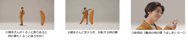 定番の『亀田の柿の種』の新CMでは、口笛で「愛の讃歌」を[野村 嘉孝1] 吹きながら登場する賀来さんの後をピッタリと付いてくる柿の種。賀来さんの様々な動きに対して、柿の種も息のあったステップを披露する躍動感のあるCMとなっています。また、新商品『亀田の柿の種 うましお』のCMでは、新商品のテーマカラーである黄色い衣装で登場。賀来さんが小さな柿の種の下から登場し、シン・ど定番の誕生というビッグニュースを声高らかにお伝えするコミカルな内容です。小さい頃から『亀田の柿の種』のファンである賀来さんが、『亀田の柿の種 うましお』を初めて食べる表情にも注目です。