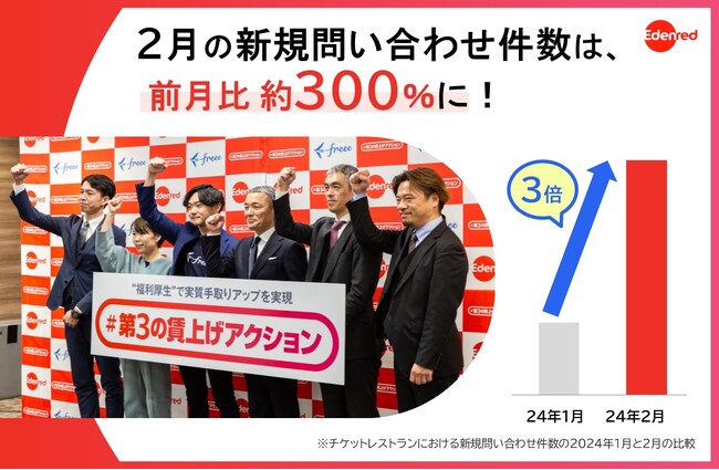 福利厚生の食事補助サービス「チケットレストラン」を展開する株式会社エデンレッドジャパンは、実質的に従業員の手取りを増やす効果があり、企業の税負担も抑えられる福利厚生サービスを「第3の賃上げ」として定義し、それを広げていくためのプロジェクト「#第3の賃上げアクション」を展開しています。2024年2月6日(火)にローンチを発表以降、中小企業を中心に新規問い合わせは増え続け、「チケットレストラン」の2月の新規問い合わせ件数は対前月比294%を記録し、過去最大の増加幅となりました。
