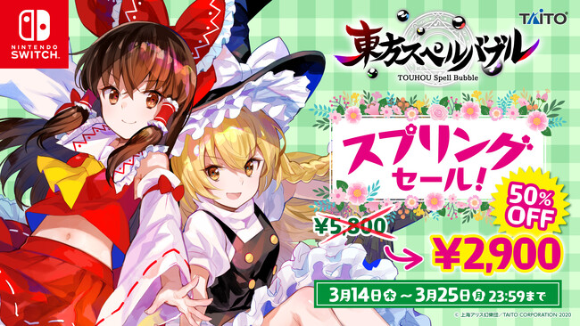 株式会社タイトー(本社:東京都新宿区)は、Nintendo Switch(TM)ダウンロード専用ソフト『東方スペルバブル』の追加ダウンロードコンテンツ「博麗霊夢 楽曲パック」の配信開始と無料楽曲追加に伴うアップデートを本日3月14日(木)に実施しました。