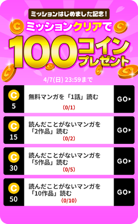 ミッションクリアで最大100コインがもらえるイベントを開催中!
