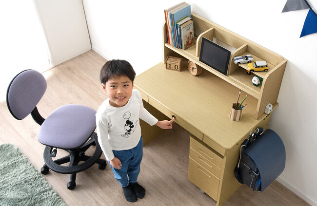 デスクの引き出しには指をかざすだけでロックが解除される指紋認証ロックを搭載しており、お子様がロック解除へのワクワク感を体感しつつ、学習用具や大切な物の自己管理を促すこともできます。