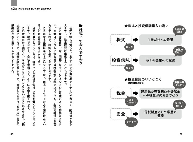 でもまず知っておいてほしいのは投資をすることにどんなメリットがあるかという点です。投資=怖い、損をするという意識を持つ方がまだまだ多いのですが、将来的な人生設計のために投資だからこそ資産を作れる理由がこの本ではていねいに説明されています。