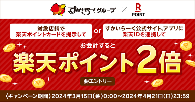 楽天ペイメント株式会社(以下「楽天ペイメント」)は、共通ポイントサービス「楽天ポイントカード」において、株式会社すかいらーくホールディングスが運営する「すかいらーくグループ」の対象店舗で、2024年3月15日(金)から4月21日(日)まで「すかいらーくグループ もれなく楽天ポイント2倍!」キャンペーンを実施します。