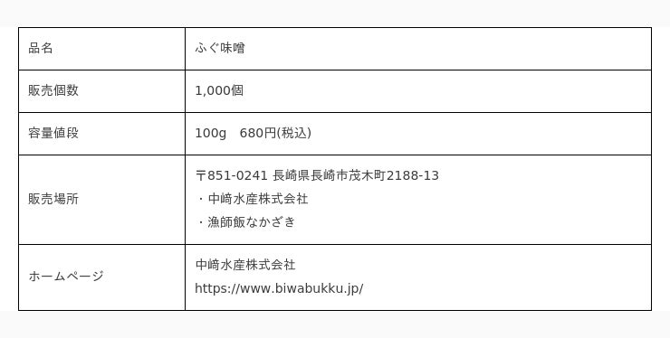 その商品は「ふぐ味噌」。この「ふぐ味噌」は改良を重ねた特殊製法でふぐの身や皮を練り込んだふぐのお味噌。唐辛子などのスパイスも厳選しています。シンプルにご飯にのせたり、お肉の漬け込みに。マヨネーズと合わせてディップソースにもアレンジできます。少し辛味があり、クセになる味わいです。中崎水産株式会社こだわりの一品を是非ご賞味ください。