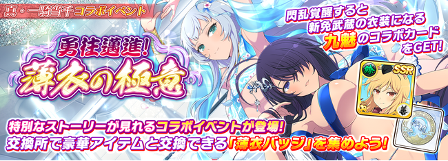 LRまで閃乱覚醒可能な「趙雲」「関羽」の新カードが登場!過去に登場した一騎当千コラボカード全てが復刻登場!「新免武蔵」姿の「九魅」が手に入るイベントも同時開催中!