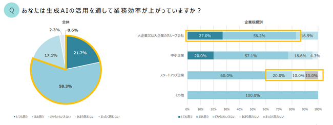 また、スタートアップ企業では、生成AIの活用率が高い反面、業務効率については否定的な回答の比率が高いということが分かりました。
