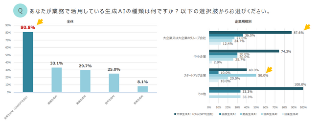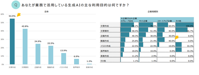また、「利用目的が動画の作成である」という回答を企業規模別でみると、大企業では25.8%、スタートアップ企業では40%となり、スタートアップ企業では動画作成が利用目的という比率が比較的高いことが分かりました。