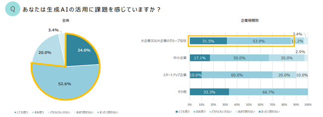 企業規模別でみると、課題を認識している方の比率は大企業(85.4%)、中小企業(67.1%)スタートアップ企業(70 %)となり、大企業、スタートアップ企業では、生成AIの活用者の70%以上の方が、生成AIの活用に課題を感じているということが分かりました。