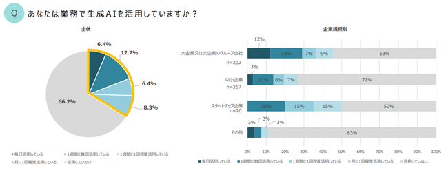 所属企業において、「業務で生成AIを活用していますか?」と尋ねたところ、全体の33.8%が、「月に1回以上生成AIを活用している」と回答しました。企業規模別での活用率は、スタートアップ企業(50%)、大企業(44%)、中小企業(26%)となり、スタートアップ企業では、全体の約半数が積極的に生成AIを業務に取り入れているということが伺えます。