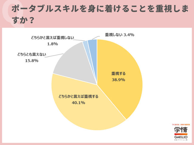 ポータブルスキルを身に着けることについて、「重視する」と回答した学生が38.9%に上りました。「どちらかと言えば重視する」40.1%を合わせると、約8割の学生が「ポータブルスキル」の習得を重視していることが分かります。「1つの企業、1つの部署でのみ役立つスキルではなく、どこでも活用できるスキルを身に付けたい」「就職した会社から転職するかもしれないので、どこでも通用するスキルを習得したい」「会社が倒産するなど、転職しないといけなくなった際に困らないようにしたい」「終身雇用ではないので、必須だと思う」「ポータブルスキルがあれば、より選択肢が拡がると思う」などの声が寄せられました。