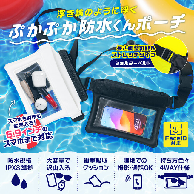 沢山入って水に浮く!『ぷかぷか防水ポーチ』で海やプールがもっと楽しくなる。IPX8認定と"水没しない"浮力で安心をプラス。スマホや財布は防水ケースに入れて、手ぶらで夏を楽しもう!夏フェスにもオススメ