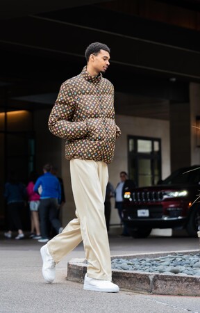 ビクター・ウェンバンヤマは、ブラウンのモノグラムパファジャケットに、タイラー・ザ・クリエイターとのコラボレーションによる2024 メンズ スプリング・コレクションから、ベージュのテーラードチノパン、そしてルイ・ヴィトンとナイキによる「エア フォース 1」を合わせました。
