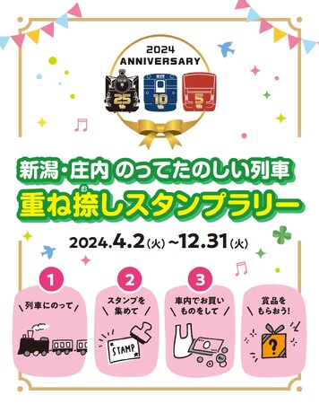 〇 JR 東日本新潟支社では、2024 年に「SL ばんえつ物語」が運行開始から 25 周年、「越乃 Shu*Kura」が 10 周年、「海里(KAIRI)」が 5 周年を迎えることを記念して、「新潟・庄内 のってたのしい列車重ね捺しスタンプラリー」を開催します。