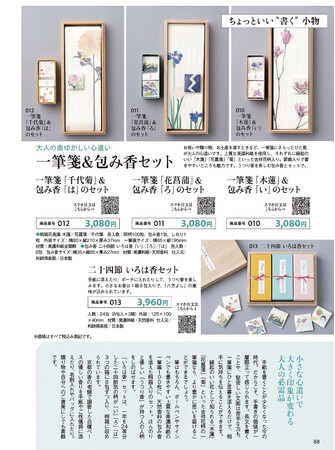 一言添える心遣いにぴったりな一筆箋と包み香。一筆箋は「木蓮」「花菖蒲」「菊」の吉祥柄入り。京都の香りの老舗で調香された優しい香りの包み香を添えて言葉を贈るのもおすすめです。
