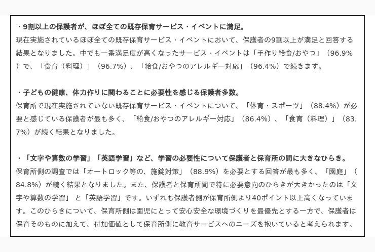 9割の保護者が今の保育サービスに満足。『子どもの保育 大規模実態調査』